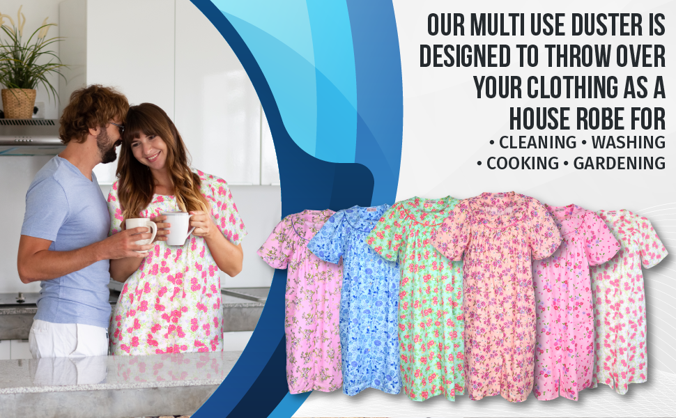 - Premium Dusters for Women: Made from blend of Cotton and Polyester, our house coats offer comfort and durability. These short sleeve house dresses with pockets are perfect to easily snap on and take off. The breathable lounge dress & robe ensures you stay cool and relaxed, while the easy-care design simplifies laundry with machine wash and low-heat drying.