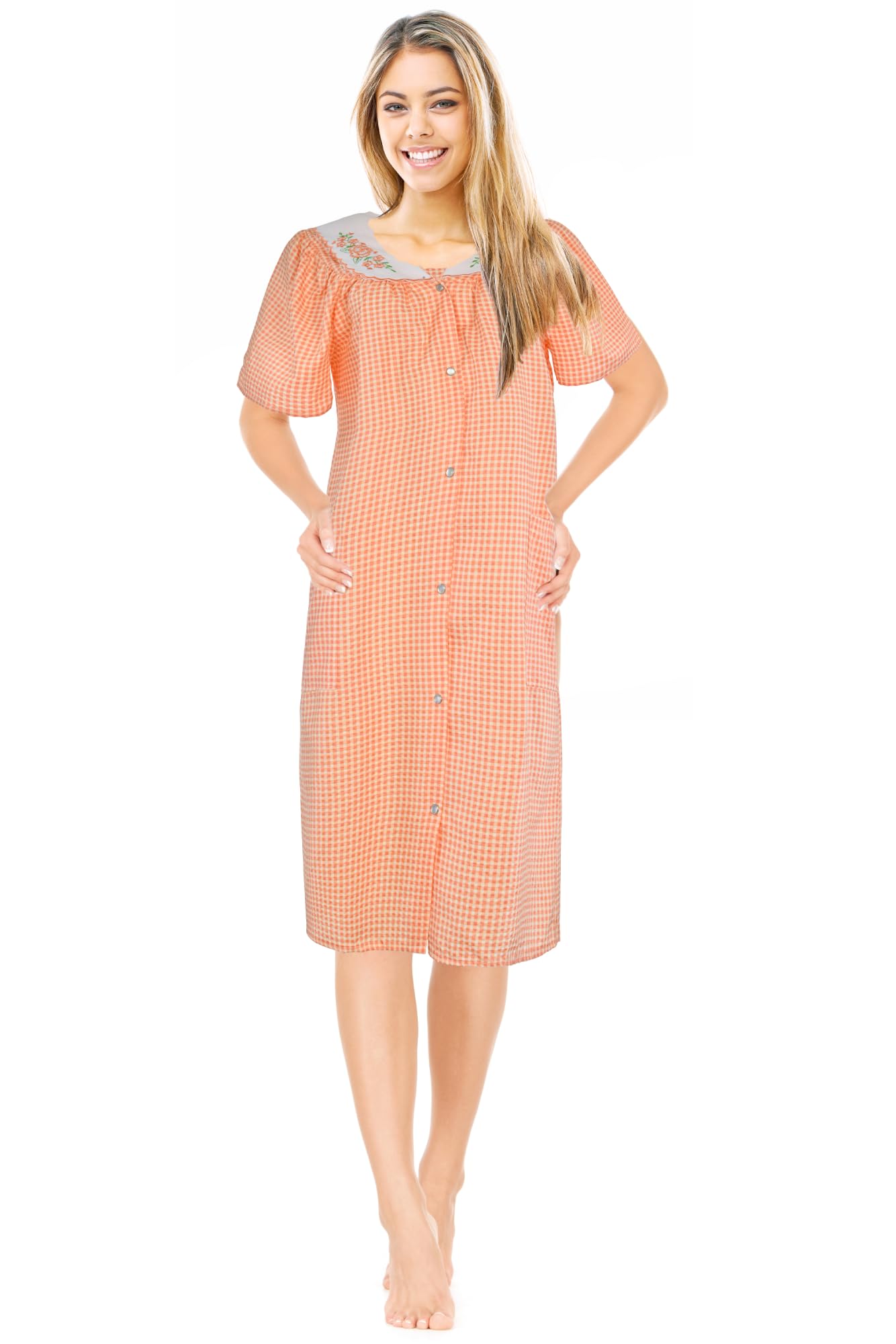 - Premium Dusters for Women: Made from blend of Cotton and Polyester, our house coats offer comfort and durability. These short sleeve house dresses with pockets are perfect to easily snap on and take off. The breathable lounge dress & robe ensures you stay cool and relaxed, while the easy-care design simplifies laundry with machine wash and low-heat drying.